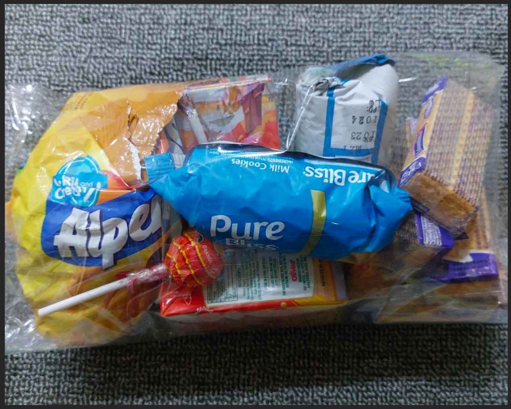 A bag of assorted candy and cookies