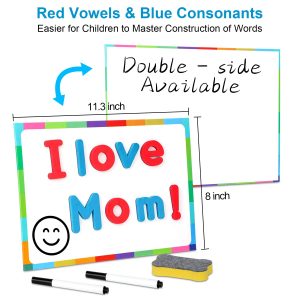 With this giant magnetic letters kit it’s easy for your child to start spelling and building short sentences like I love you mom. Children that can sound and ready to spell have so much fun with this hands on language toy.
